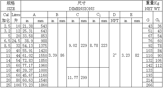 型 號 | 公稱容積/L | 公稱通徑/mm | 公稱壓力/MPa |